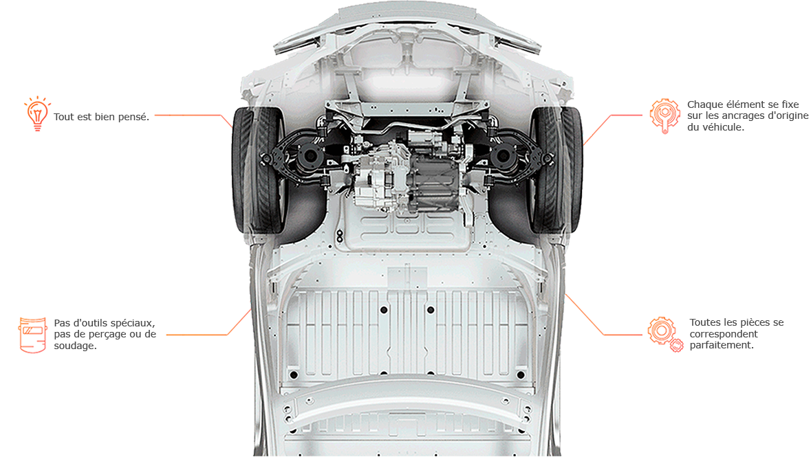 Les formes lisses de la plaque de protection en acier reproduisent la forme du dessous de caisse de la voiture, ce qui améliore l'aérodynamique.