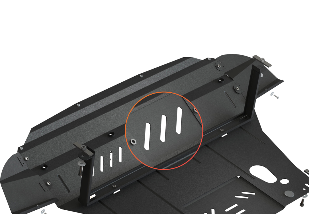 Pour éviter la surchauffe du moteur et de la boîte de vitesses, nous avons usiné des passages d'air dans la partie avant de la plaque de protection en acier, destinés à éliminer la chaleur excessive. Lorsque la voiture est en mouvement, l'air circule librement, absorbe la chaleur et l'élimine efficacement.
